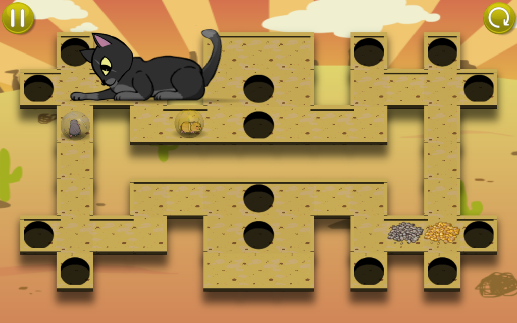 Hamster Chase is the story of a family of happy hamsters trying to make their way home while on the run from evil Sour Puss. Help Sasha, Goldie, Snowflake and Ting-Ting follow the trail of seeds by guiding them around obstacles in 100 challenging levels! Avoid the holes, dodge the flying balls, run from the spinning tops, veer away from the vacuums, and even do battle with Sour Puss himself using spring-loaded boxing gloves 🙂