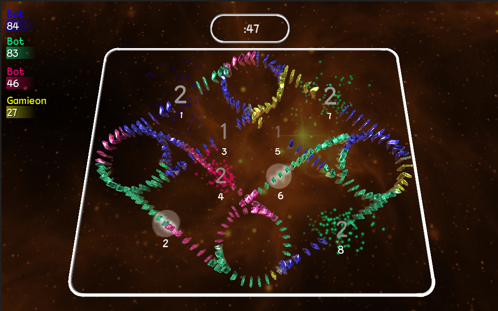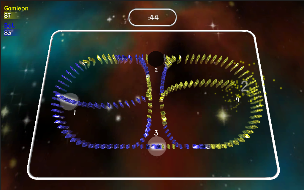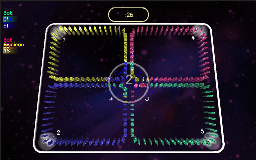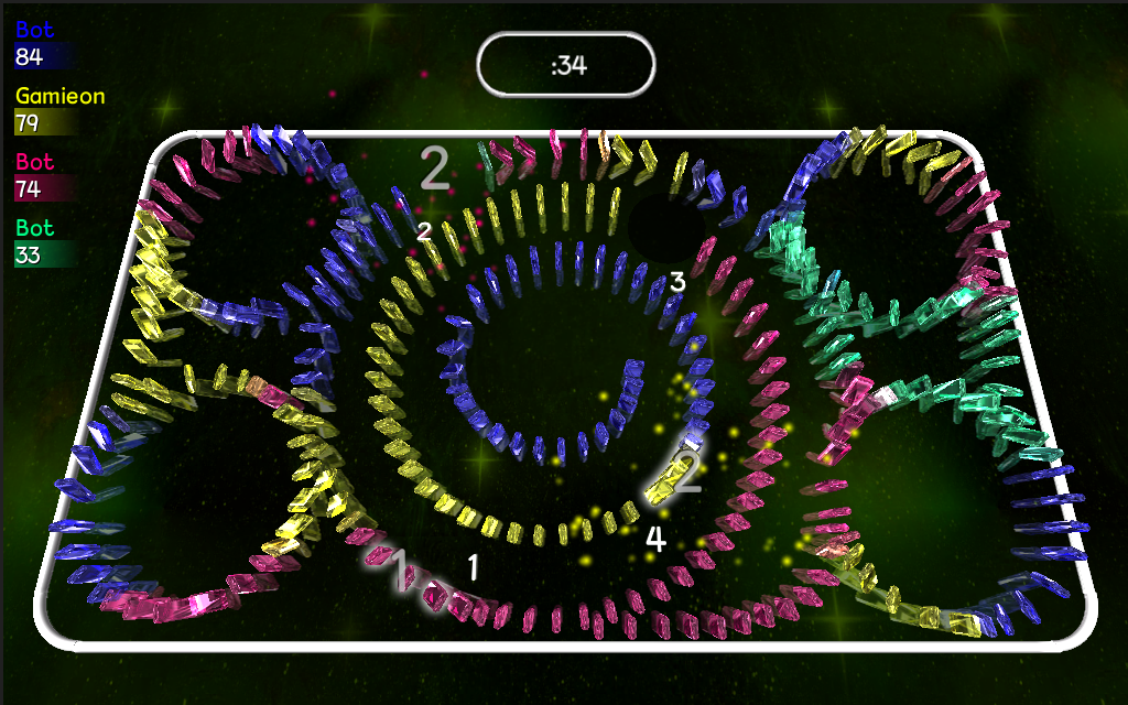 Domino Arena is a competitive game where you have sixty seconds to make as many dominoes your color as possible. In each level is a path of falling dominoes, each one colored by the player who owns that domino. When dominoes fall onto other dominoes, they become the same color. You have only a minute to make as many dominoes your color as possible by creating new paths for them to fall, and by blocking paths that your opponent is using.